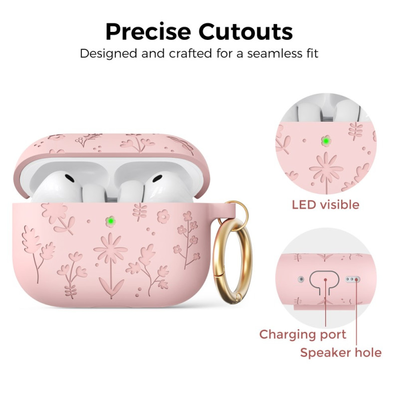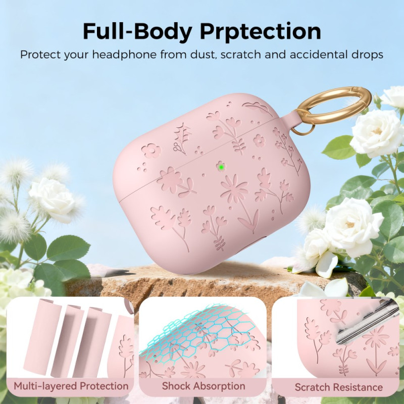 Proteja os seus AirPods Pro 3 com estilo com esta capa de silicone com um requintado motivo floral em relevo e um anel de metal dourado. O design integral oferece proteção completa contra pó, riscos e quedas acidentais.
