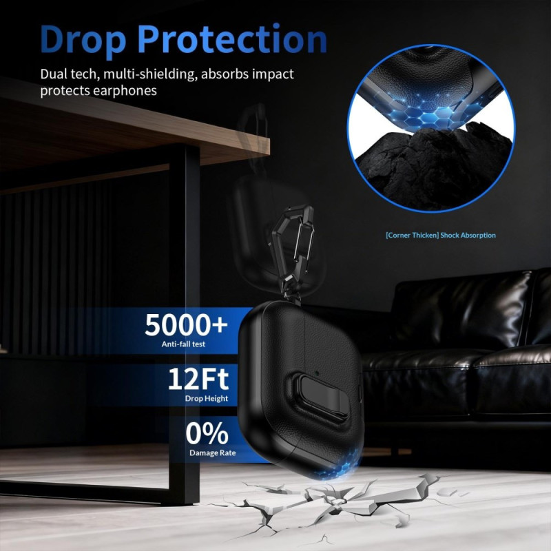 Capa de proteção robusto para AirPods Pro 3 com suporte integrado. Design elegante em dois tons com textura de pele de pêssego, prática argola de fecho e mosquetão incluídos. Proteção completa contra choques, riscos e pó.
