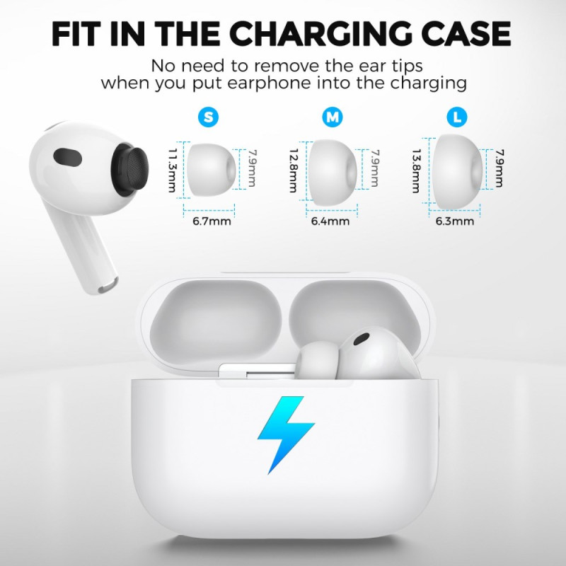 Pontas auriculares de substituição (2 pares) em silicone de alta qualidade para AirPods Pro 3. Conforto superior, ajuste seguro e melhor isolamento de ruído. Proteção contra poeiras integrada para uma qualidade de som ideal.