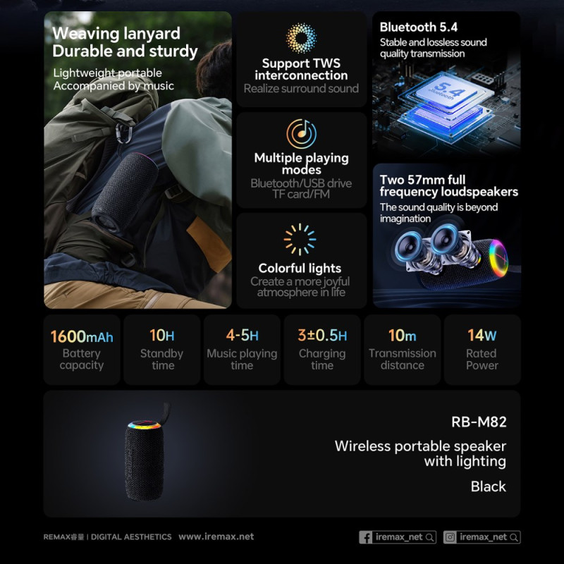 Desfrute de uma experiência de áudio envolvente com este altifalante portátil com dois controladores de 57 mm. Tecnologia Bluetooth 5.4 para uma ligação estável, emparelhamento TWS para som estéreo e luzes coloridas para uma atmosfera festiva. Vários modos de reprodução: Bluetooth, USB, cartão TF e FM. Tempo de funcionamento de 4-5h com bateria de 1600mAh.