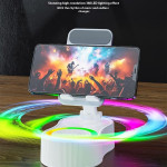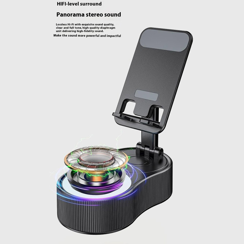 Descubra este suporte multifuncional 3 em 1: altifalante Bluetooth de alta qualidade, bateria externa de 2000 mAh e suporte para telemóvel ajustável a 360°. Com iluminação ambiente incorporada para criar uma atmosfera única. Ligação estável até 10 metros.