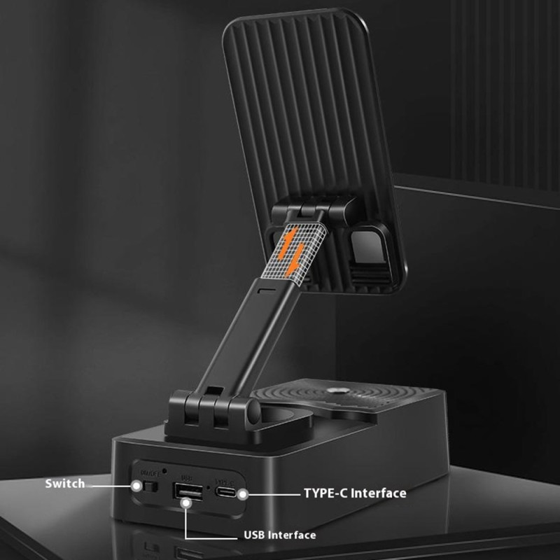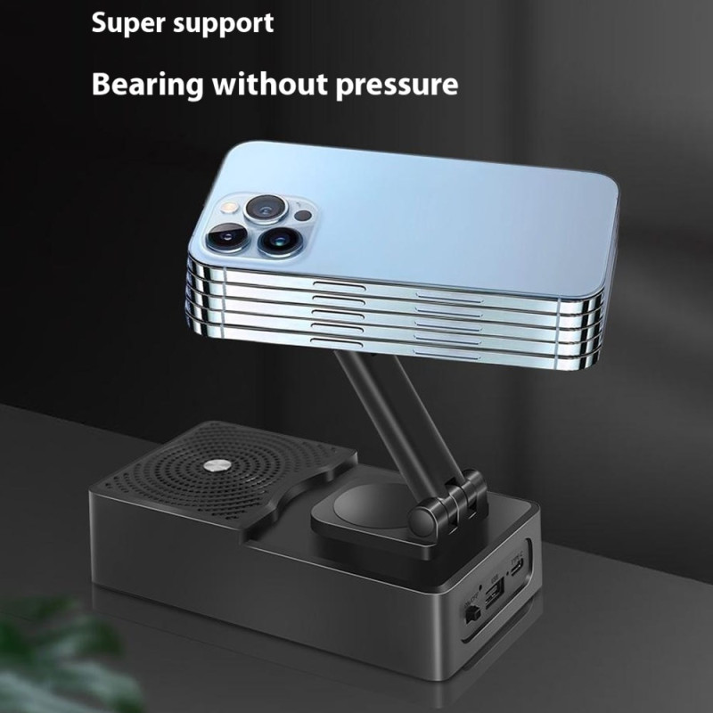 Support ajustable multifonction avec enceinte 5W intégrée et batterie de secours 1200mAh. Rotation 360°, Bluetooth 5.1, design pliable ultra-compact. Idéal pour le streaming audio, les appels vidéo et le rechargement d'urgence en déplacement.