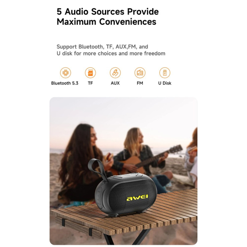 Descubra uma experiência de áudio imersiva de 360° com o altifalante AWEI KA1. Com tecnologia Bluetooth 5.3, proteção IPX5 à prova de água e iluminação RGB dinâmica, proporciona graves profundos e agudos cristalinos.