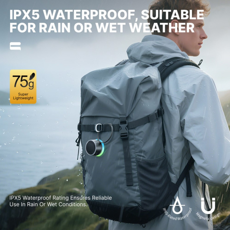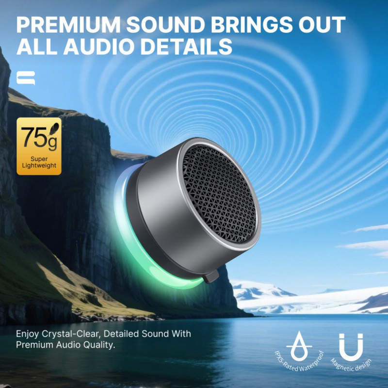 Este altifalante magnético compacto fixa-se facilmente a qualquer superfície metálica, dando-lhe uma grande liberdade de colocação no exterior. O seu design leve e o cordão de transporte significam que pode ser preso ao guiador ou a um saco para acompanhar as suas actividades. O altifalante de 36 mm proporciona um som nítido apesar do seu pequeno tamanho. A função TWS permite-lhe emparelhar dois altifalantes para uma experiência estéreo envolvente, enquanto a iluminação RGB cria um ambiente visual dinâmico. A sua certificação IPX5 garante uma resistência eficaz a salpicos e chuva ligeira. A duração da bateria é de até oito horas, dependendo da forma como a luz é utilizada.