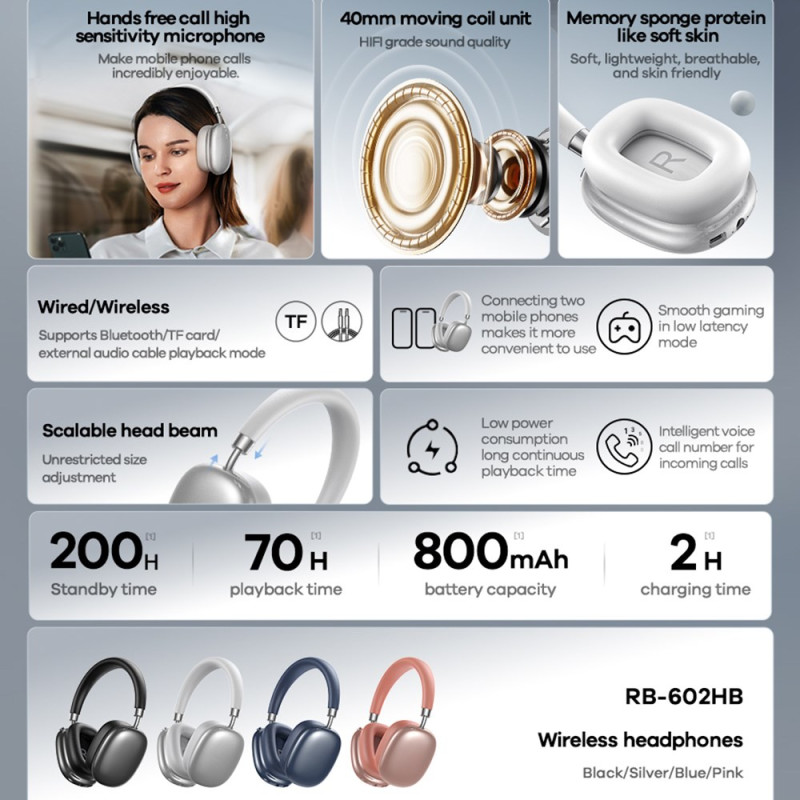Deixe-se envolver por uma experiência de som envolvente com os auriculares sem fios REMAX cor-de-rosa. Com tecnologia Bluetooth 5.4, asseguram uma ligação rápida e estável com todos os seus dispositivos. A sua unidade de 40 mm proporciona um som HiFi rico, perfeito para música, chamadas ou vídeos. Desfrute de uma impressionante autonomia da bateria de até 70 horas de reprodução contínua. Leve e confortável, com almofadas de espuma viscoelástica, é fácil de usar durante todo o dia. Versátil, suporta a reprodução através de Bluetooth, cartão TF ou cabo de áudio de 3,5 mm.