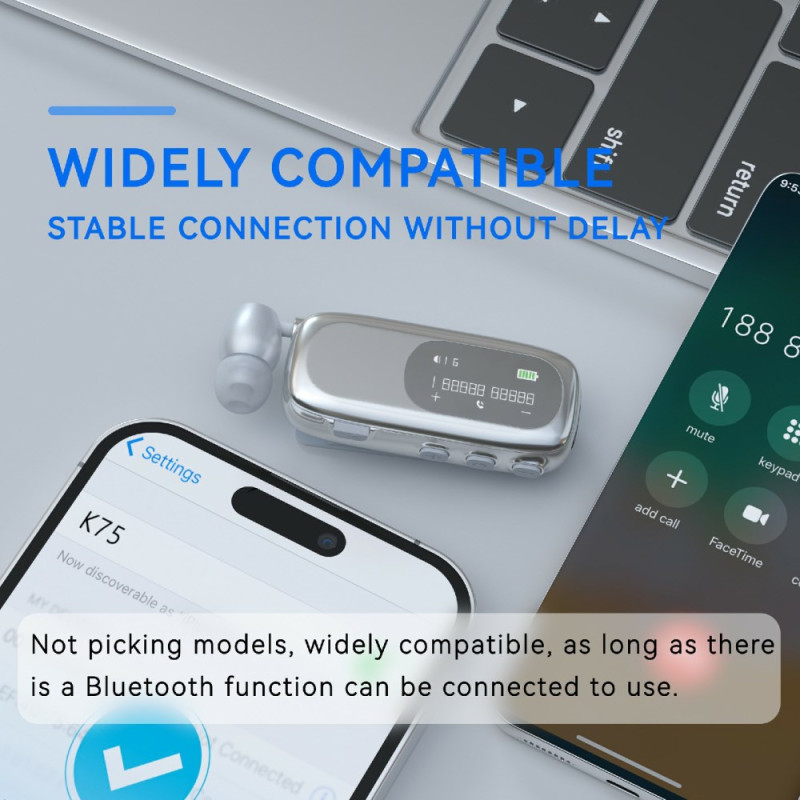 L’écouteur Bluetooth professionnel K75 intègre un écran LCD offrant un affichage clair des appels, de l’état audio, des pistes et du niveau de batterie, facilitant la gestion des usages professionnels. Les alertes par vibration et les annonces vocales renforcent la réactivité sans avoir à consulter le téléphone. Sa charge rapide de vingt minutes assure jusqu’à vingt heures de communication, tandis que l’ENC garantit des appels nets dans des environnements bruyants. La fonction d’assistance photo permet un déclenchement à distance sur les smartphones compatibles.