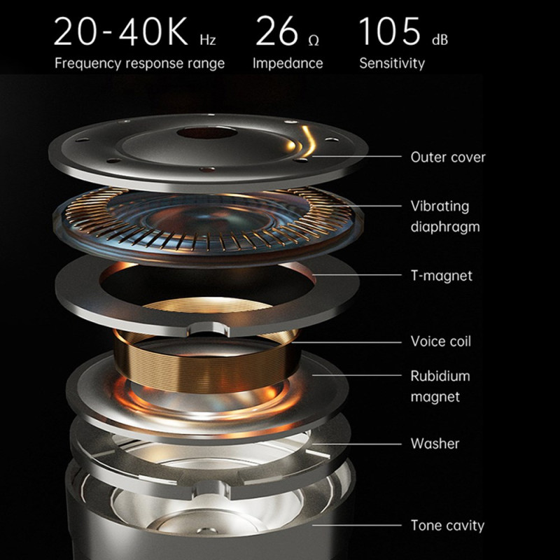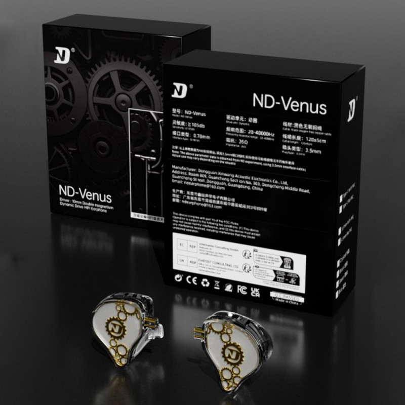 Os auriculares ND Venus utilizam um transdutor dinâmico com um diafragma magnético duplo, concebido para proporcionar uma reprodução de som detalhada e potente, com uma clareza notável nos vocais e uma extensão limpa até 40 kHz. A sua arquitetura interna baseia-se na afinação acústica de várias camadas e numa cavidade traseira ventilada, optimizando a pressão do ar para aumentar o impacto e melhorar a dinâmica. O cabo amovível de dois pinos (0,75-0,78 mm) permite a substituição ou atualização. Inspirado na estética mecânica, o design apresenta formas industriais finas e precisas, enquanto o design ergonómico garante um ajuste estável e confortável.