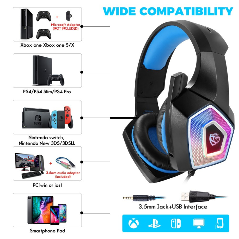 Os auriculares para jogos KOTION EACH V-1 incluem iluminação RGB dinâmica para melhorar a imersão e acrescentar uma dimensão visual impressionante a cada sessão de jogo. Os seus controladores de 40 mm oferecem uma resposta de frequência de 20 a 20.000 Hz, garantindo um som claro, rico e preciso para uma melhor perceção dos detalhes do jogo. Concebidos para proporcionar conforto, combinam uma estrutura leve com almofadas em pele respirável. A compatibilidade alargada é assegurada por um adaptador incluído, enquanto o microfone incorporado garante comunicações claras.
