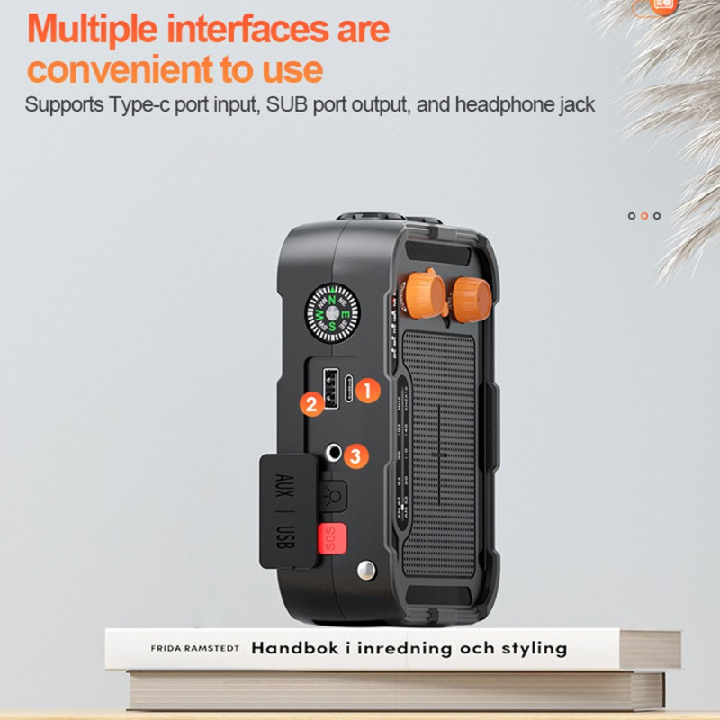 La batterie d’urgence multifonction Outdoor 5000mAh combine charge solaire, manivelle et radio FM/AM pour une autonomie totale en extérieur. Équipée d’un panneau solaire 5.5V/55mA, d’une sortie USB-A 5V/2.1A et d’un port Type-C, elle se recharge dans toutes les conditions. Son double éclairage LED (1W 120 lumens + 6W 500 lumens) éclaire efficacement les zones proches ou lointaines. Compacte, légère (300 g) et fabriquée en ABS ignifugé, elle intègre une batterie polymère 5000mAh fiable, idéale pour le camping et les urgences.