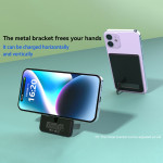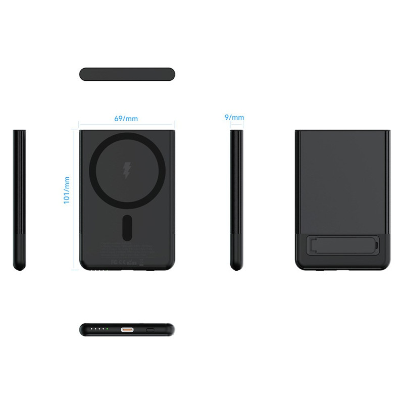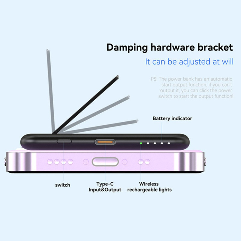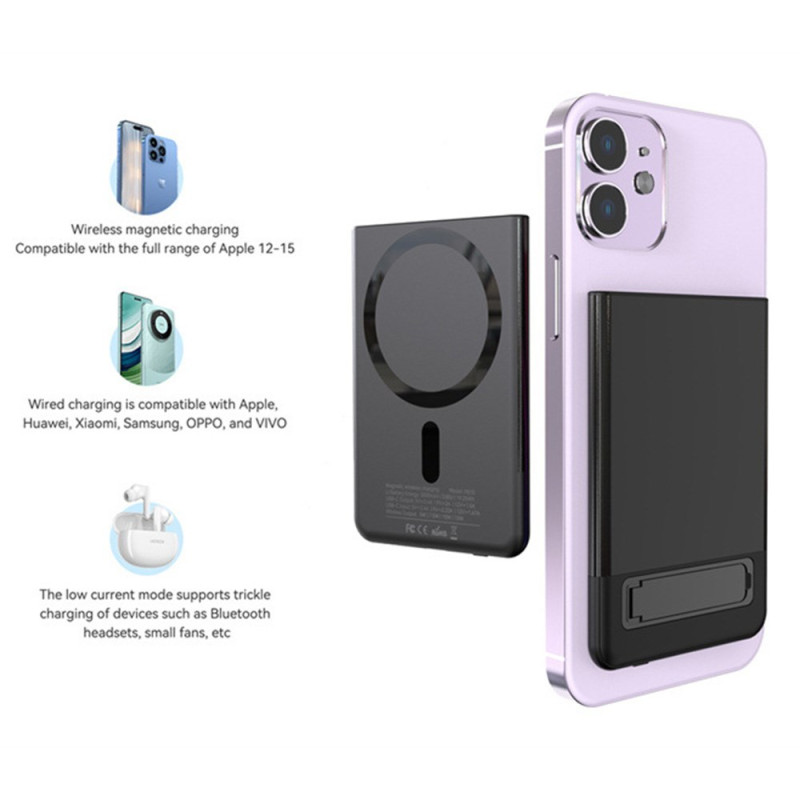 A união perfeita entre a estética metálica e a eficiência sem fios está finalmente aqui. Concebida para uma portabilidade máxima, esta bateria externa de 5000mAh tem um perfil ultrafino de 9 mm. A sua capa metálica é uma garantia de durabilidade e oferece um aspeto topo de gama. Possui um carregamento rápido sem fios até 15 W, para que possa carregar o seu dispositivo de forma eficiente sem cabos. O suporte integrado é ideal para utilizar as mãos livres durante o carregamento. Com 5000mAh de potência, é o impulsionador de energia ideal para um dia atarefado.