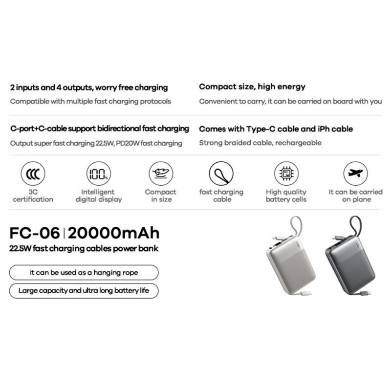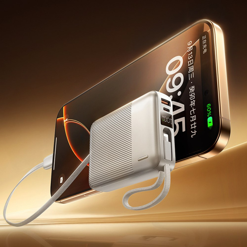 A gestão da bateria e dos cabos é simplificada ao máximo com esta unidade portátil REMAX 20.000mAh. Esta bateria externa de alta capacidade garante uma vida útil alargada do dispositivo para voos de longo curso e viagens. Inclui cabos Lightning e Type-C retrácteis, eliminando a necessidade de transportar acessórios adicionais. Suporta um carregamento ultrarrápido de 22,5 W, compatível com o carregamento PD de 20 W do iPhone 15/16. Com quatro opções de saída, pode alimentar vários dispositivos em simultâneo. O ecrã LED digital fornece uma leitura instantânea da energia restante.