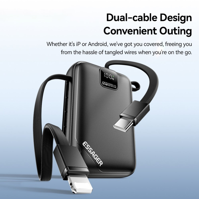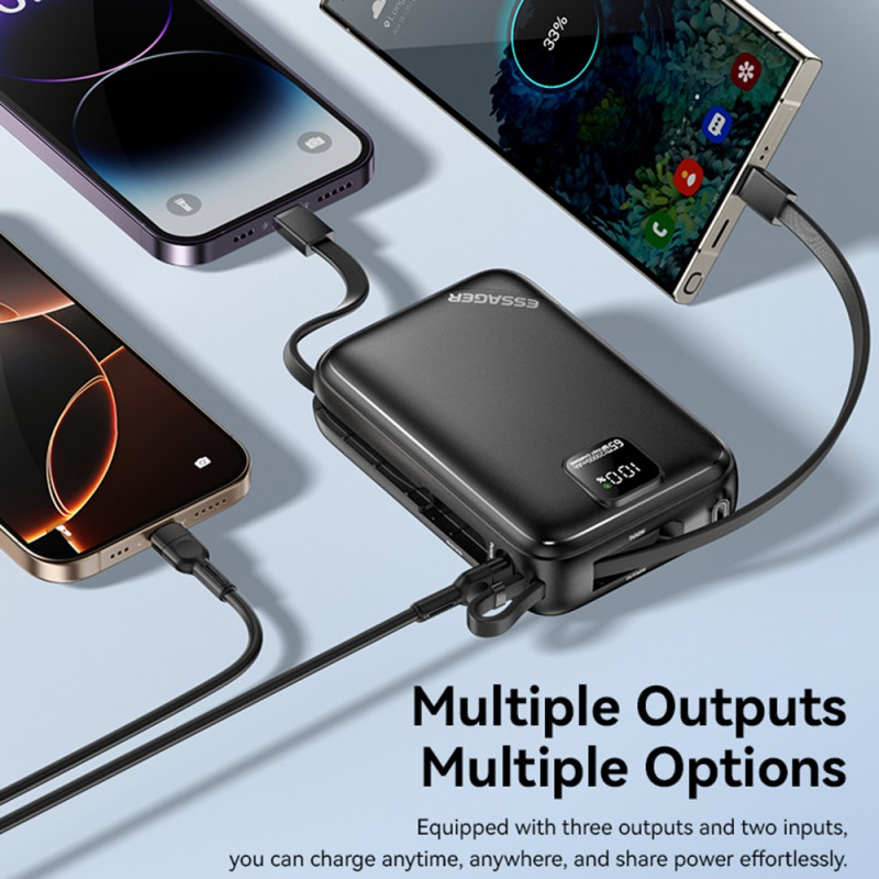 O nível de potência necessário para um computador portátil topo de gama está agora disponível, incluindo uma solução de carregamento completa. Esta Bateria Externa ESSAGER 20000mAh oferece uma potência máxima de 65W, garantindo o carregamento rápido de computadores portáteis, tablets e smartphones. A integração dos cabos Type-C e Lightning elimina a confusão, enquanto a sua capacidade mantém os seus dispositivos ligados durante dias. Suporta uma entrada de 60 W para recarga rápida da própria bateria. O seu visor digital inteligente permite-lhe gerir com precisão a duração da bateria e a sua conformidade com as normas europeias CE e RoHS é a prova da sua fiabilidade.