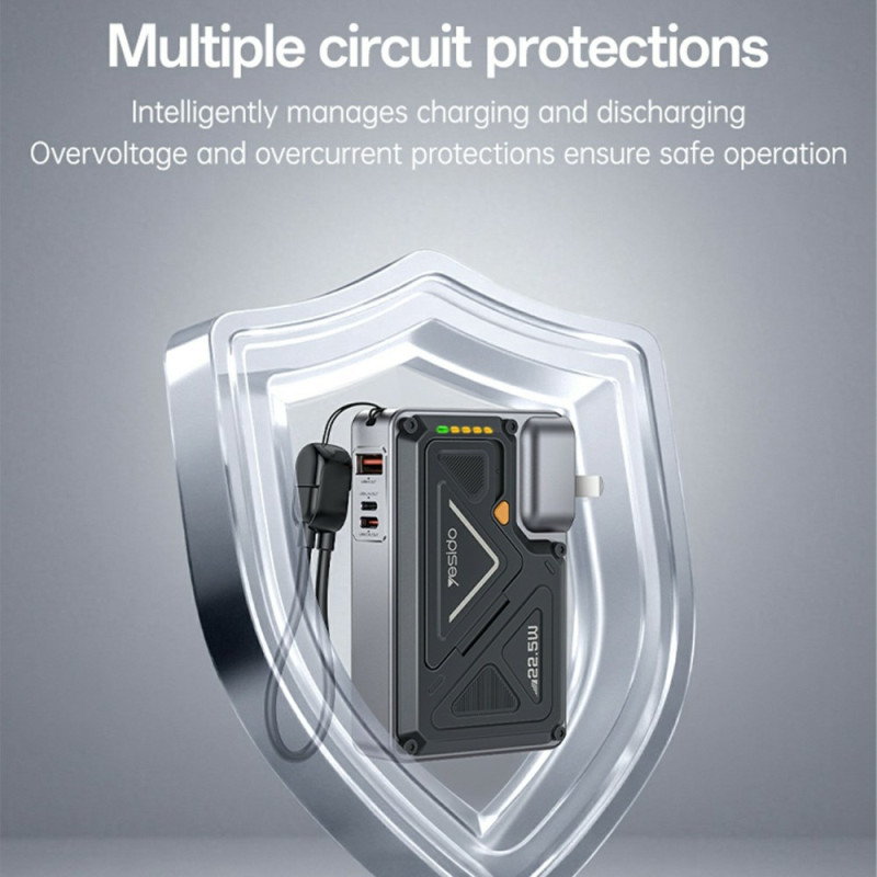 A integração de um carregador de parede e de uma bateria sem fios numa única unidade resolve os desafios do carregamento em vários cenários. Esta bateria externa YESIDO oferece dupla funcionalidade AC/DC para a máxima versatilidade. Fornece uma carga magnética sem fios até 15 W e uma carga rápida com fios de 22,5 W (via USB). O dispositivo inclui um suporte integrado para visualização horizontal durante o carregamento. A segurança é garantida por chips de gestão inteligentes e pela construção em PC à prova de fogo V0, enquanto quatro indicadores LED claros fornecem uma monitorização instantânea e precisa do estado de carregamento.