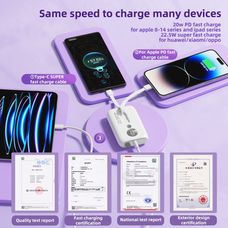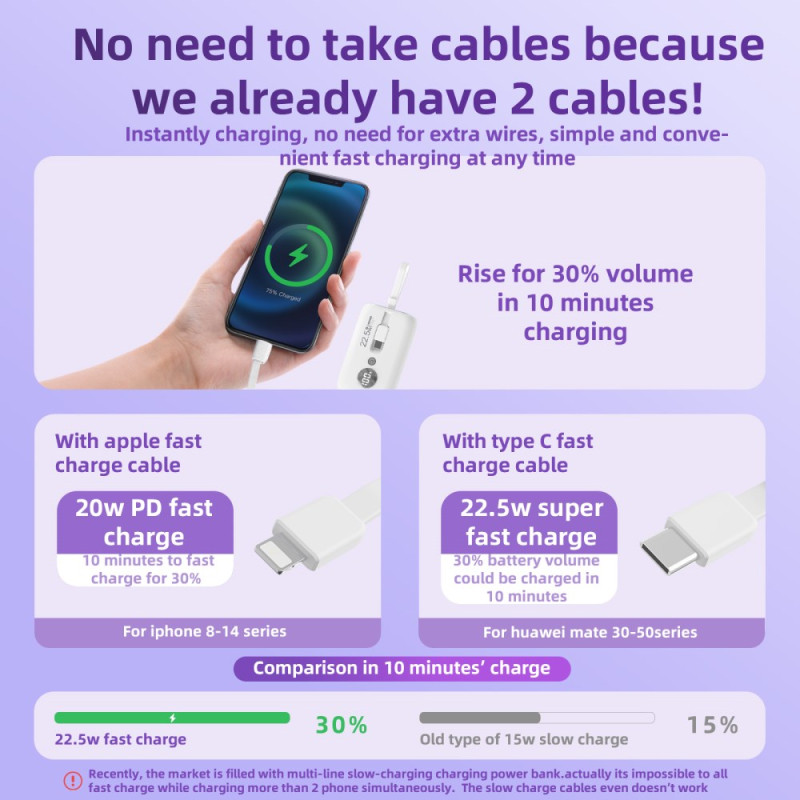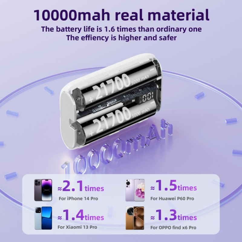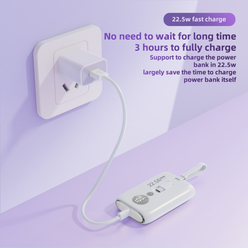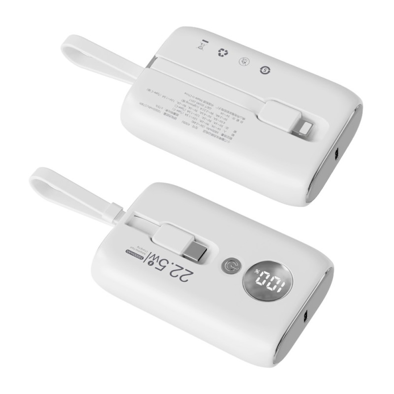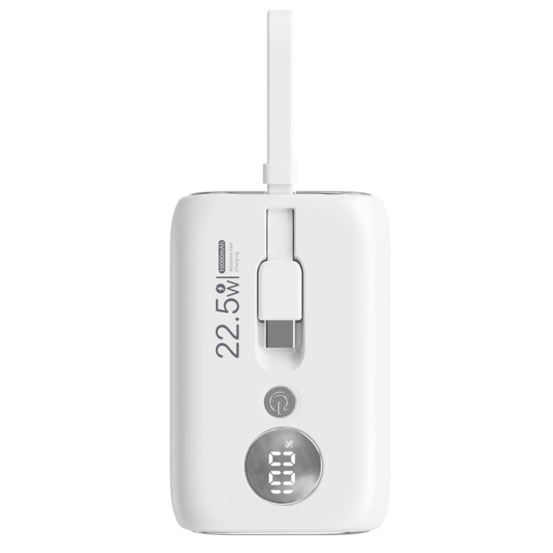 O controlo térmico avançado e a integração de cabos redefinem o carregamento rápido num formato de bolso. Esta Bateria Externa ROISKIN de 10000mAh foi concebida para a máxima comodidade: integra dois cabos (Type-C e Lightning) que servem também de alça de mão. A sua potência de carregamento atinge 22,5 W (através do cabo Tipo C), utilizando um chip de nova geração para manter uma temperatura baixa e preservar a saúde das baterias. O visor digital inteligente fornece a quantidade exacta de bateria restante, substituindo as luzes indicadoras. Compacto e leve, é o aliado perfeito para a mobilidade.
