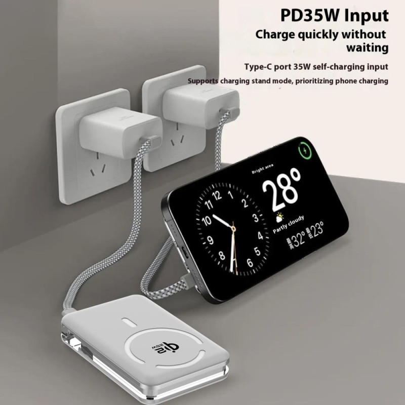 Esta bateria externa magnética combina potência e praticidade para o levar em movimento. Graças à tecnologia Qi2.2, oferece um carregamento rápido sem fios de até 25 W, enquanto as portas Tipo C permitem um carregamento com fios de até 35 W para dispositivos compatíveis. O suporte integrado facilita a utilização do telemóvel com as mãos livres durante o carregamento. Com a sua capacidade de 10.000mAh e tamanho compacto, é fácil de transportar e o seu ecrã digital facilita o controlo dos níveis de energia.