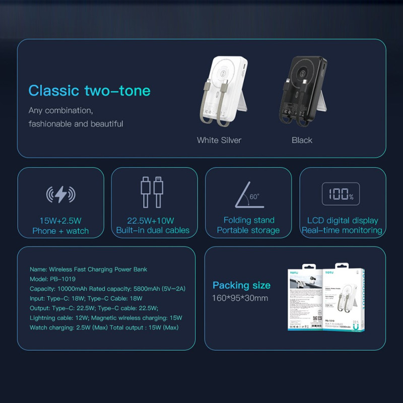 Esta bateria magnética externa combina potência e praticidade para acompanhar os seus dispositivos todos os dias. Com os seus 10000mAh, proporciona uma autonomia confortável, enquanto o carregamento magnético sem fios de até 15W facilita a alimentação rápida de smartphones compatíveis. A porta Type-C e os cabos integrados oferecem uma variedade de opções de carregamento, incluindo um modo dedicado para relógios conectados. O suporte integrado permite colocar o telemóvel numa posição estável durante o carregamento, ideal para ver um vídeo ou verificar as notificações.
