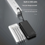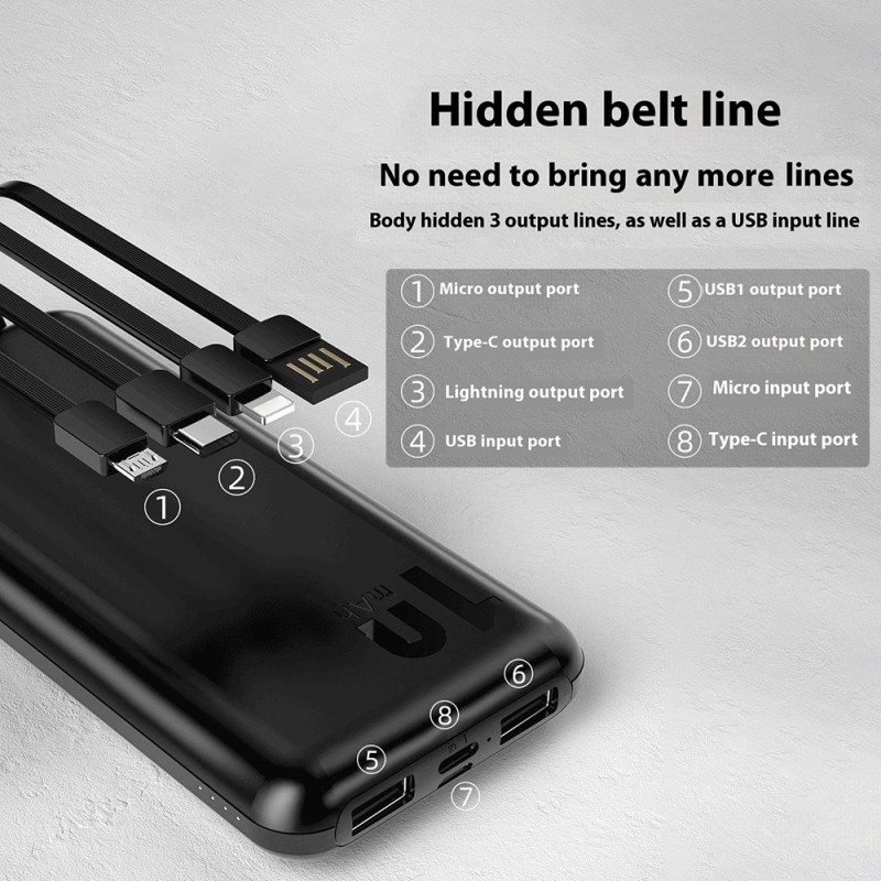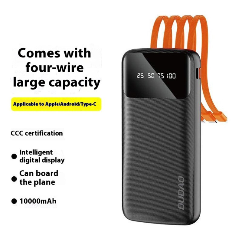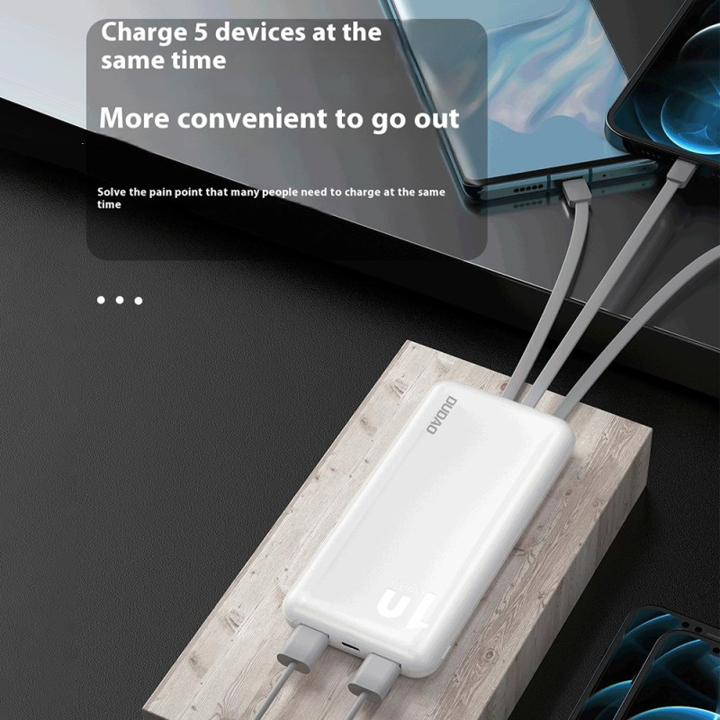 Esta bateria externa DUDAO 10000mAh oferece uma solução prática para recarregar vários dispositivos sem ter de transportar cabos extra. Inclui três cabos de saída e um cabo de entrada USB, permitindo uma utilização imediata em movimento. Capaz de alimentar até cinco dispositivos ao mesmo tempo, é ideal para uso pessoal e para partilha. O seu tamanho compacto torna-o fácil de segurar e de colocar numa mala. O visor digital de quatro níveis mostra claramente o nível de bateria restante, para que possa antecipar quando é altura de recarregar.