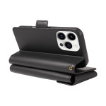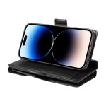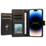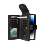 Capa multifunções em pele PU para iPhone 14 Pro Max. Com várias ranhuras para cartões, compartimentos para notas, função de suporte integrada e alça de mão amovível. Fecho magnético seguro e recortes precisos para um acesso fácil.