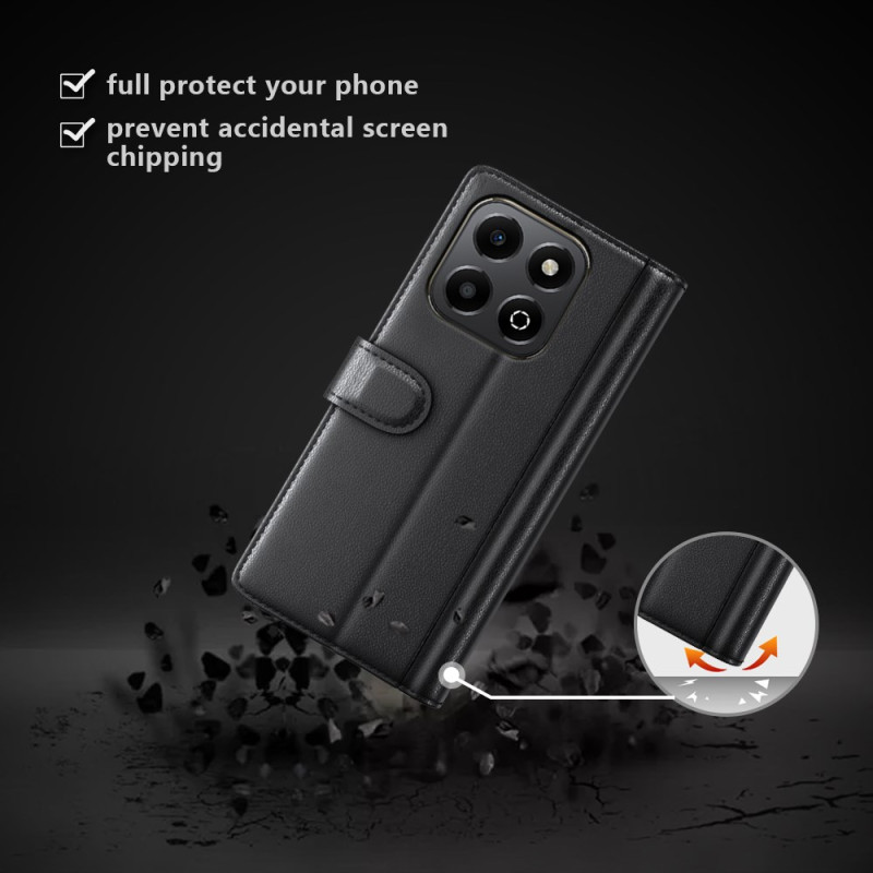 Proteja o seu Honor X6b 4G com estilo com esta capa para carteira em pele genuína dividida. Com 3 ranhuras para cartões, um bolso para bilhetes e um suporte dobrável para ver o telemóvel em modo mãos-livres, esta capa combina elegância e praticidade para uma utilização quotidiana.
