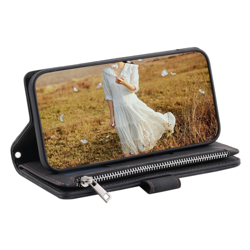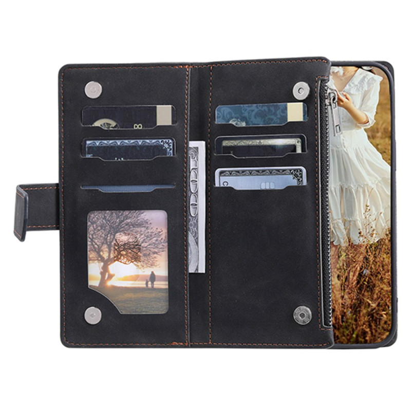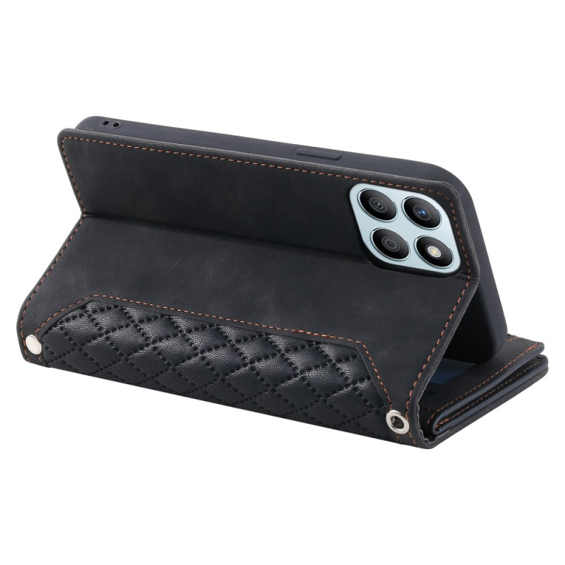 Capa elegante para carteira para o Honor X6b 4G com design cosido com diamantes. Inclui várias ranhuras para cartões, bolso com fecho para moedas, suporte para mãos livres e fecho magnético seguro. Proteção total com uma prática correia de mão.