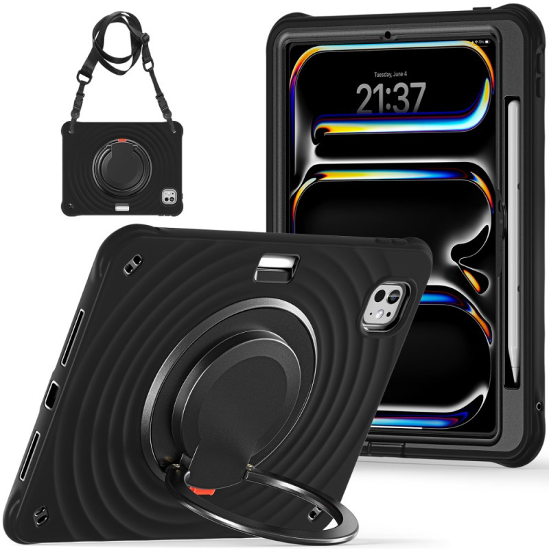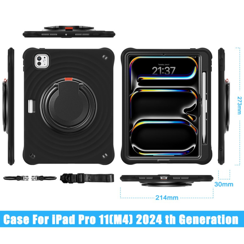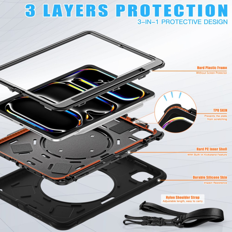 Esta capa robusta para iPad Pro 11 (2025) / 11 (2024) oferece uma proteção superior graças ao seu design híbrido. Inclui um suporte rotativo de 360°, uma ranhura para stylus, um design de absorção de choques e uma pega rotativa. Ideal para trabalho e lazer, inclui uma alça de ombro ajustável para facilitar o transporte.