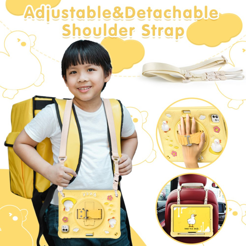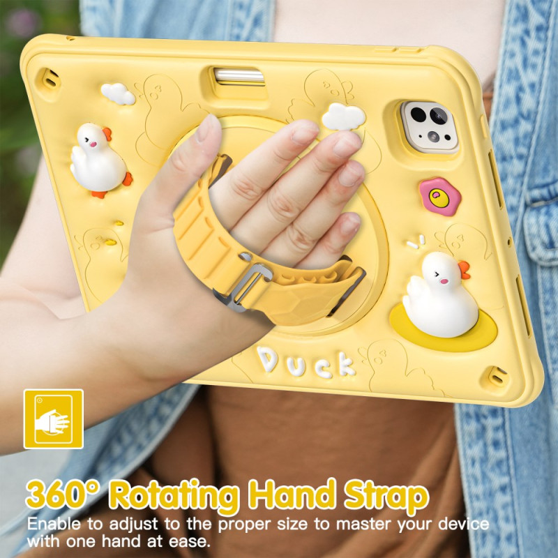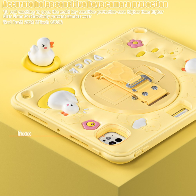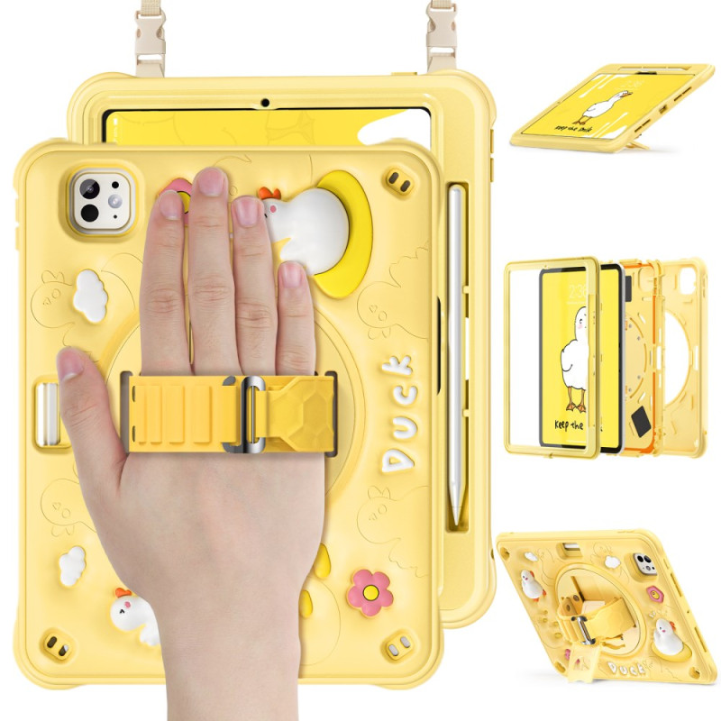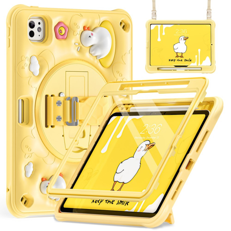 Descubra a nossa inovadora capa para iPad Pro 11, que combina proteção e estilo. Com um suporte prático, uma alça de ombro amovível e um adorável design de pato, oferece proteção multicamada com cantos reforçados. A pega rotativa de 360° proporciona uma aderência confortável, ideal para a utilização diária.