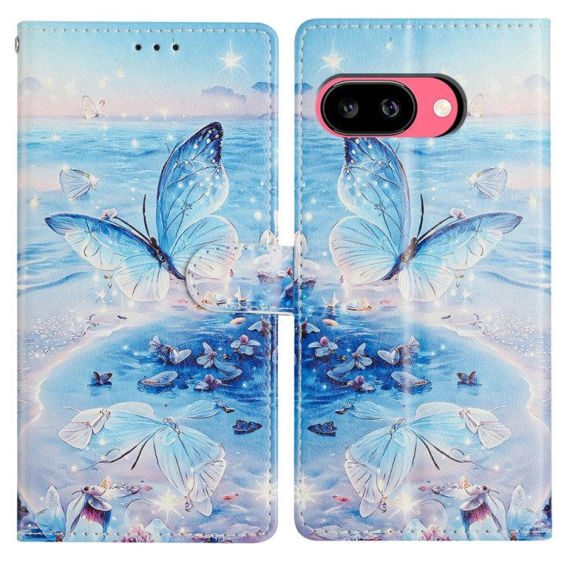 Capa elegante para carteira para o Google Pixel 10A com motivo de borboleta do oceano. Inclui 2 ranhuras para cartões, 1 compartimento para fotografias e um bolso lateral espaçoso. Suporte integrado para visualização em mãos-livres e alça de mão amovível incluída.