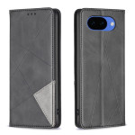 Capa elegante em pele para o Google Pixel 10A com um padrão geométrico requintado. Inclui ranhuras integradas para cartões bancários e documentos de identificação, um suporte para visualização em mãos-livres e um fecho magnético seguro.
