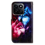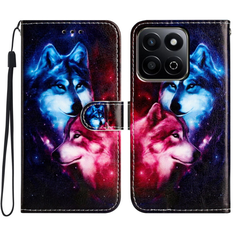 Capa elegante para carteira com um soberbo motivo de casal de lobos. Combina estilo e funcionalidade com 3 ranhuras para cartões, suporte ajustável e fecho magnético seguro. Proteção total em pele PU de primeira qualidade para o seu aparelho Honor.