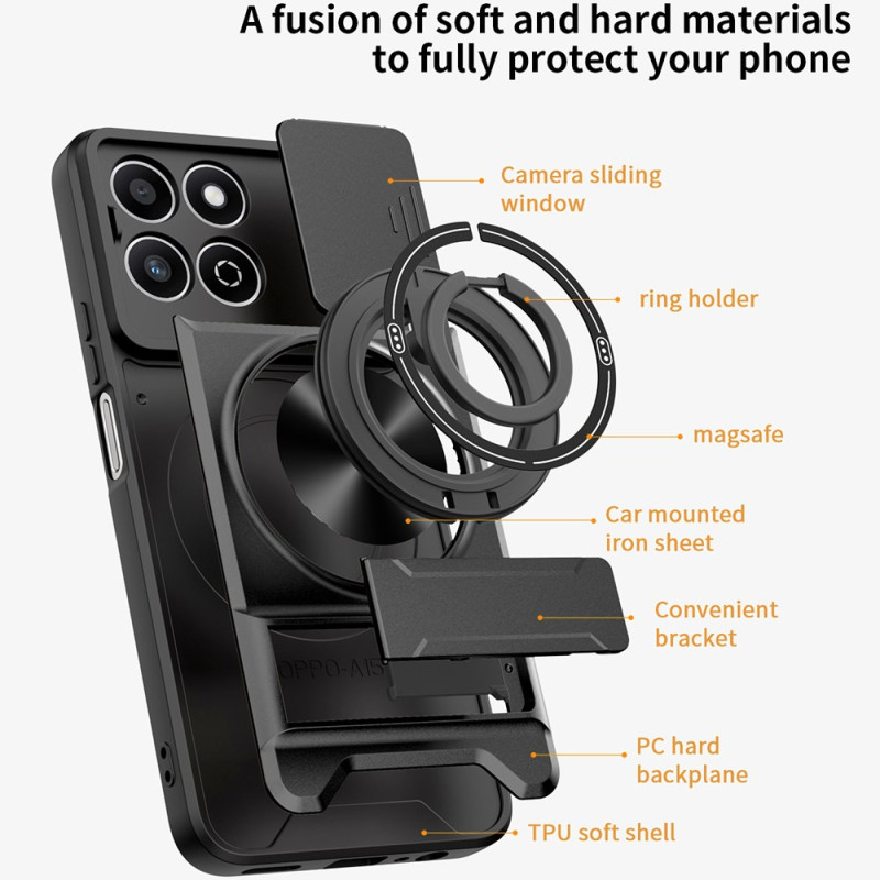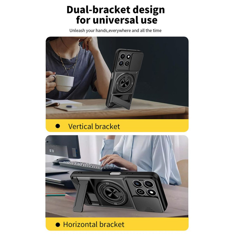 Proteja o seu Honor X7c 5G / 4G / 200 Smart 5G com estilo com esta capa inovadora. Proteção dupla TPU/PC resistente ao impacto, anel rotativo de 360° integrado, suporte dobrável para visualização em mãos-livres e tampa deslizante da câmara para uma segurança óptima...