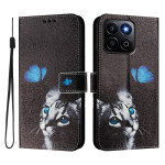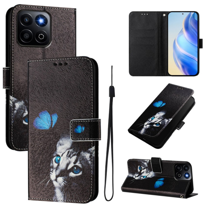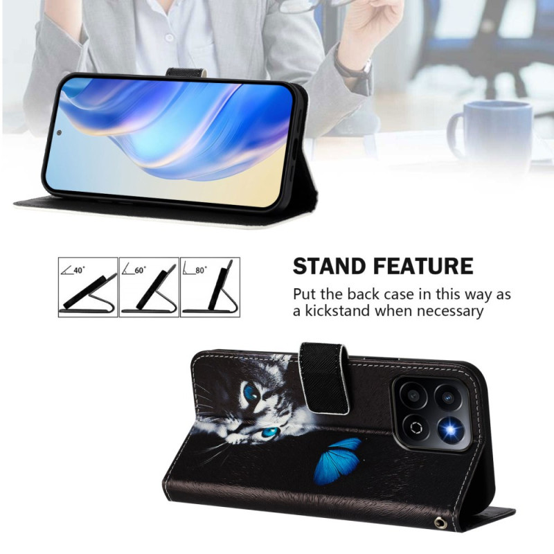 Proteja o seu telemóvel com estilo com esta capa para carteira com um encantador motivo de borboleta e gato. Com 3 ranhuras para cartões, um suporte multi-ângulo ajustável e uma correia de pulso segura, combina praticidade e elegância para uso quotidiano.
