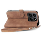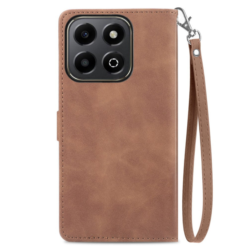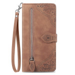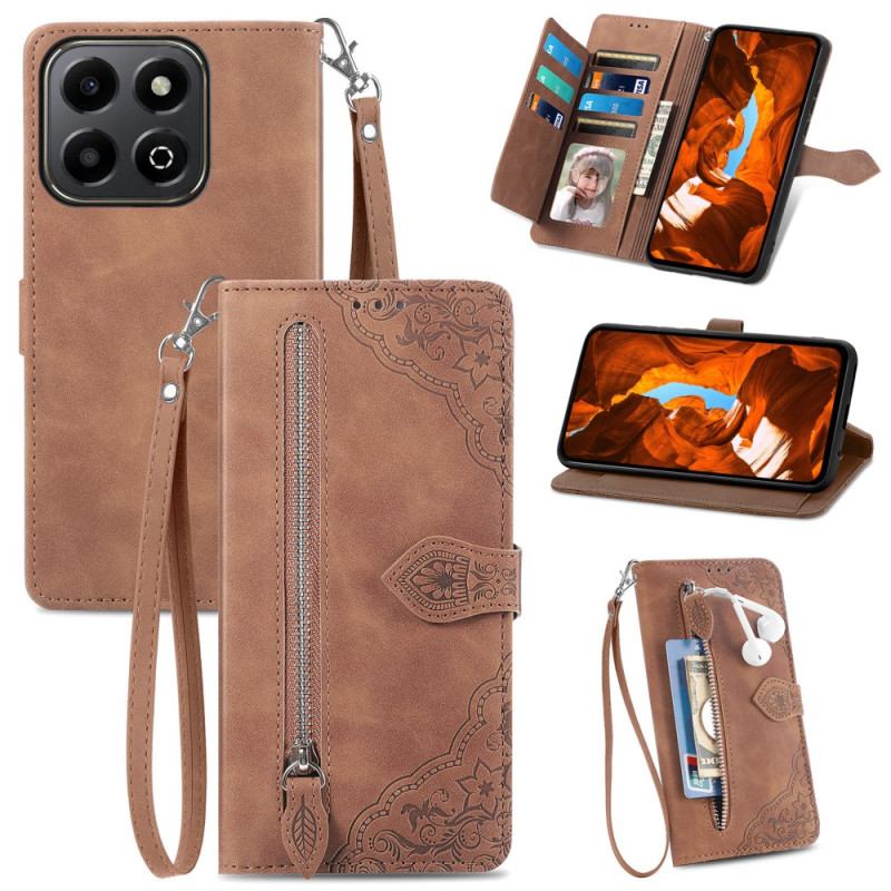 Capa elegante para carteira em pele PU com motivos florais sofisticados. Possui várias ranhuras para cartões, bolso exterior com fecho de correr, suporte para mãos livres e fecho magnético seguro. A prática alça de mão facilita o transporte.