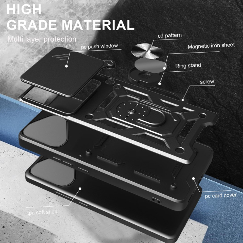 Descubra a nossa inovadora capa para o Honor 400 Lite, que combina proteção e funcionalidade. Fabricada em TPU e plástico, oferece resistência ao choque de nível militar, um prático suporte rotativo e uma tampa deslizante para proteger a lente.