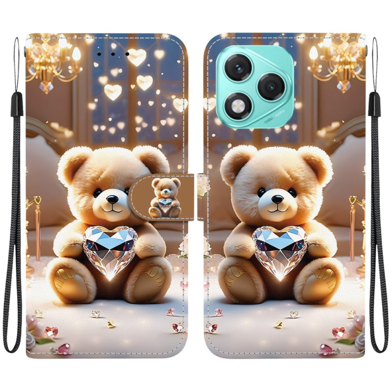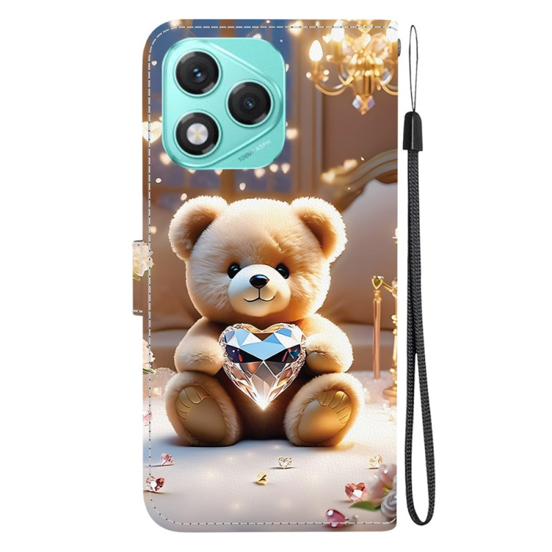 Capa elegante para carteira com suporte rebatível e design em forma de urso de diamante para o Honor 400 Lite 5G. Inclui 2 ranhuras para cartões, um compartimento para dinheiro e uma correia de pulso amovível. Proteção magnética segura contra riscos e choques.