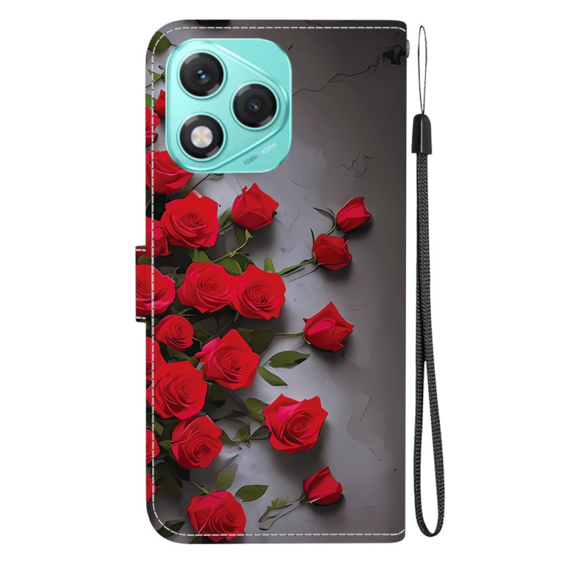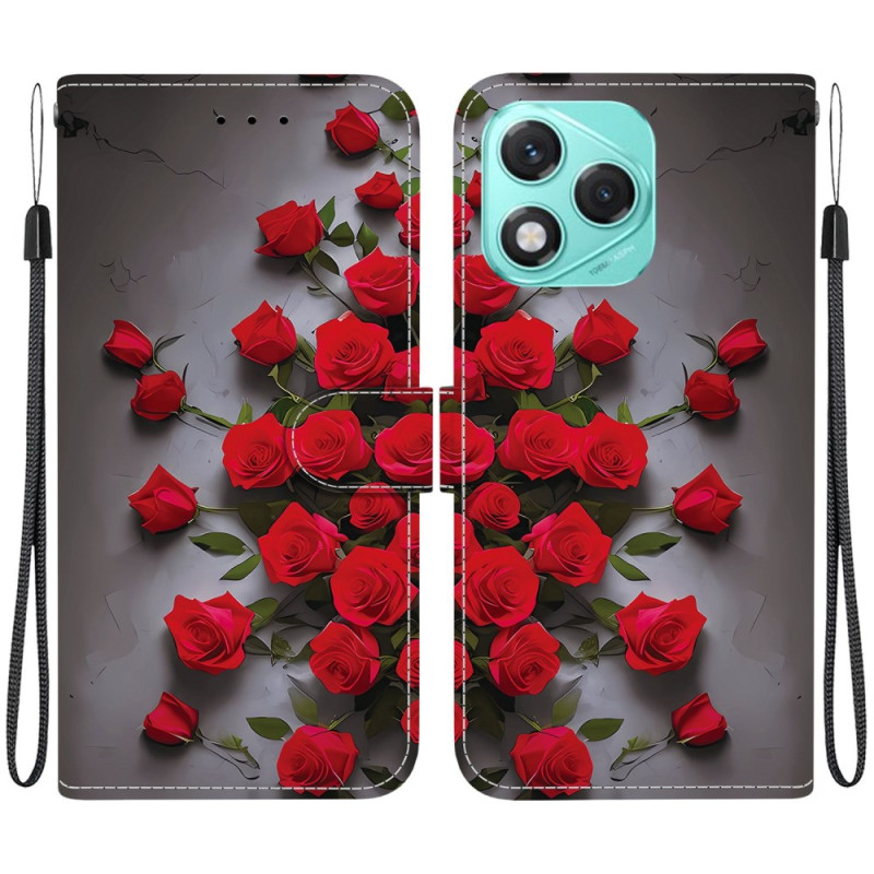 Capa elegante em pele sintética com padrão de rosas vermelhas para o Honor 400 Lite 5G. Inclui um suporte dobrável, 2 ranhuras para cartões, um compartimento para dinheiro e uma alça de mão amovível. Fecho magnético seguro para uma proteção óptima.
