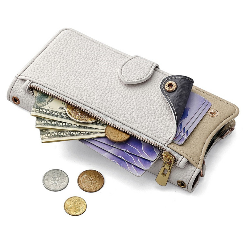 Capa elegante em pele PU com textura de lichia e revestimento em TPU macio. Design único em cauda de peixe irregular. Inclui 2 ranhuras para cartões, espelho de maquilhagem, compartimento para dinheiro e bolso com fecho. Função de suporte integrada...