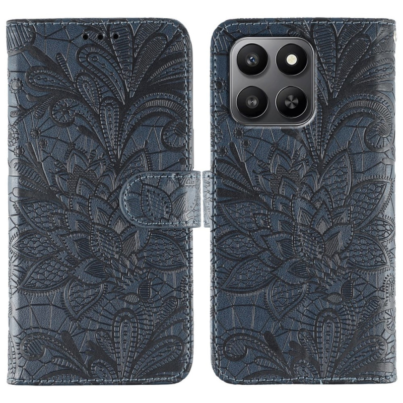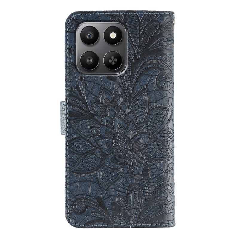 Capa elegante com aba e motivos florais em renda para o seu Honor 400 Smart 5G / X7d 5G / 4G. Design requintado e proteção ideal, com ranhuras para cartões, suporte integrado e alça de mão prática para uma utilização quotidiana simplificada.