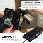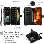 Capa elegante multifunções que combina proteção reforçada e funcionalidade. Inclui 10 ranhuras para cartões, um bolso com fecho de correr e alças amovíveis para um transporte sem mãos. Acabamento brilhante e glamoroso com suporte dobrável integrado.