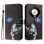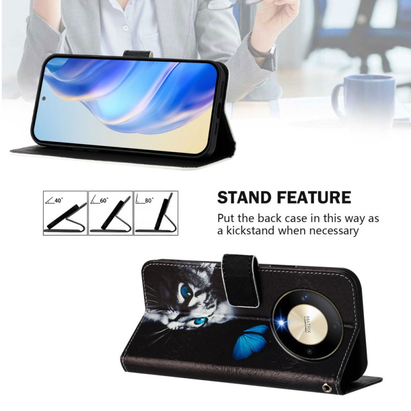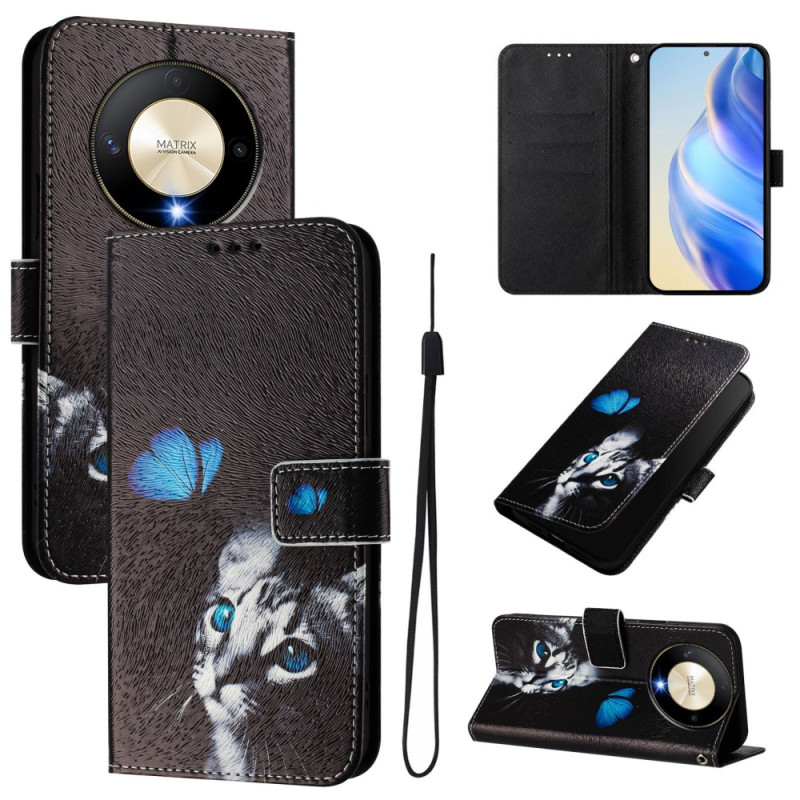 Capa elegante para carteira com motivos encantadores de borboletas e gatos. Inclui um suporte multi-ângulo ajustável, 3 ranhuras para cartões, uma correia de pulso segura e proteção reforçada contra quedas.