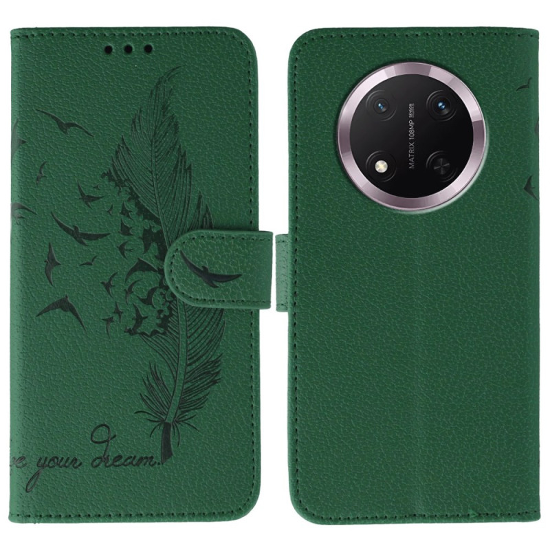Descubra a nossa elegante carteira em pele PU para o Honor Magic 7 Lite / X9c. Combinando estilo e funcionalidade, oferece proteção completa com o seu padrão de penas impresso, suporte ajustável para visualização versátil, ranhuras para cartões e compartimento para notas.