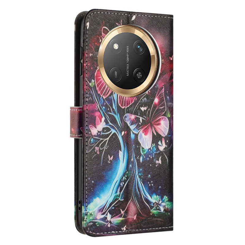 Proteja o seu Honor Magic 7 Lite / X9c com estilo com esta capa para carteira com motivos de borboletas e árvores. Com ranhuras para cartões, um suporte dobrável e um prático fecho magnético, combina estilo e funcionalidade.