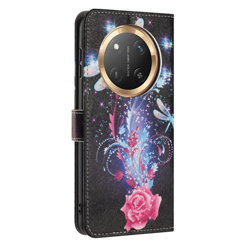 Proteja o seu Honor Magic 7 Lite / X9c com estilo com este capa de carteira com um requintado motivo de libélula. Com compartimentos para cartões e dinheiro, um suporte dobrável e um prático fecho magnético, combina estilo e funcionalidade.