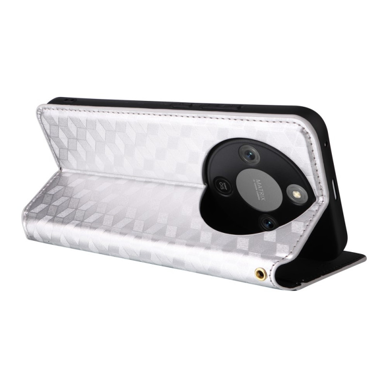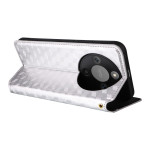 Capa elegante em pele PU com motivo de diamante 3D gravado. Design requintado que combina estilo e funcionalidade com suporte para cartões integrado, função mãos-livres e fecho magnético. Proteção total de 360° contra choques e riscos.