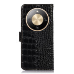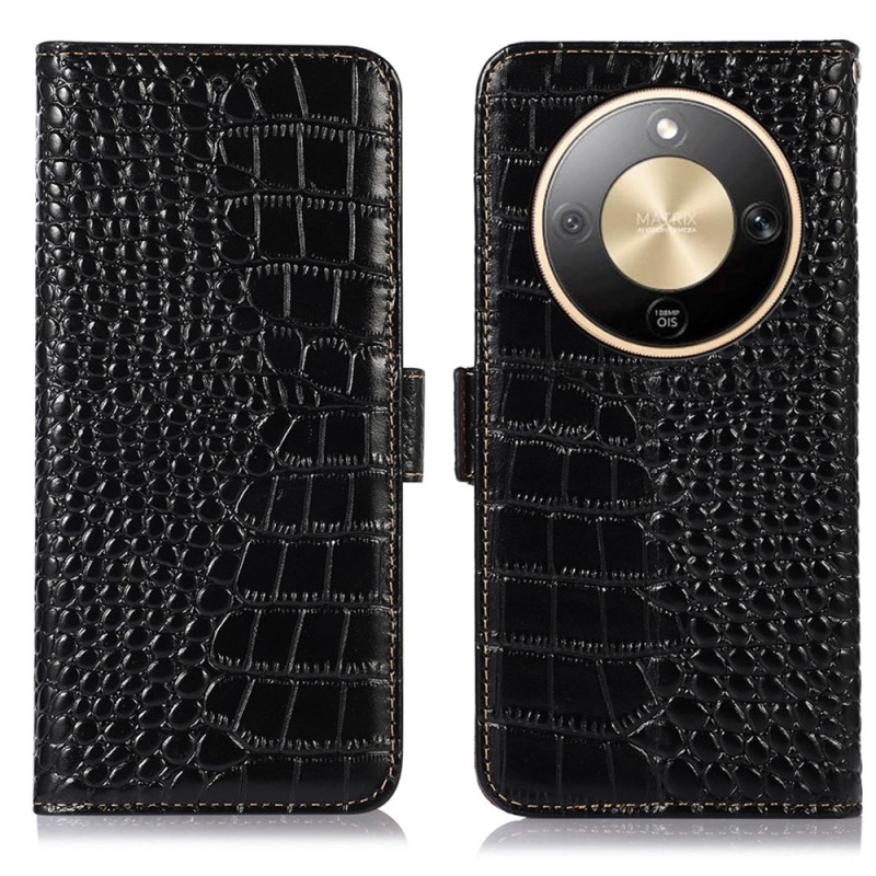 Capa elegante em pele genuína com textura de crocodilo para o Honor Magic 8 Lite 5G . Proteção RFID incorporada, 3 ranhuras para cartões, 1 bolso para notas e suporte de visualização ajustável.