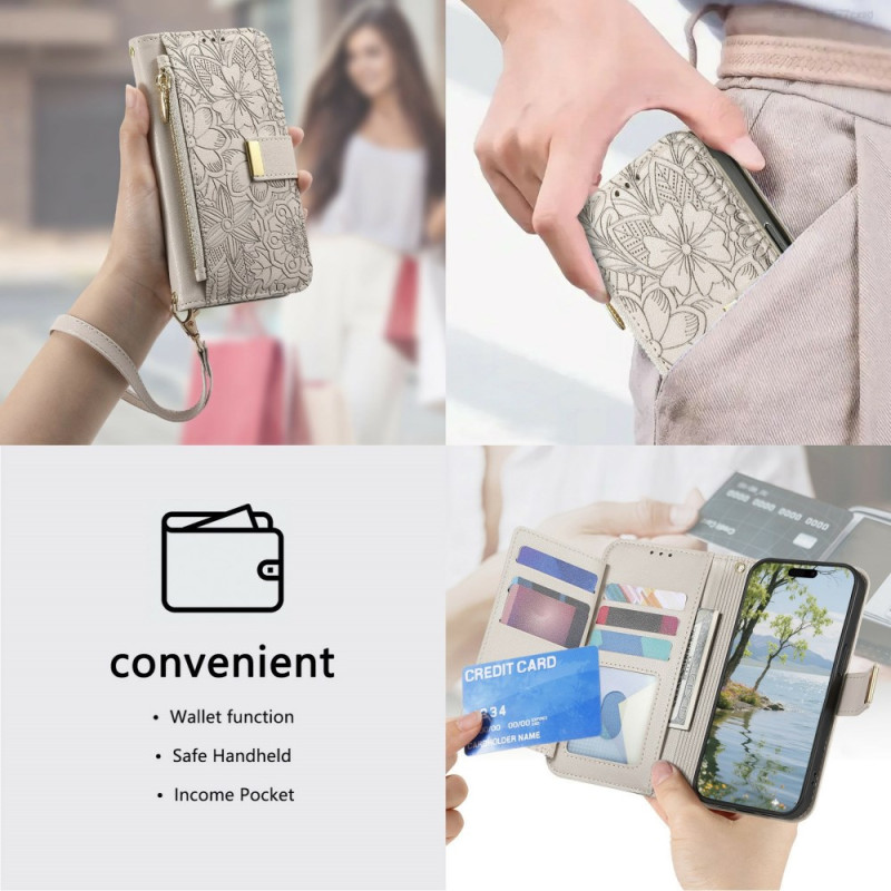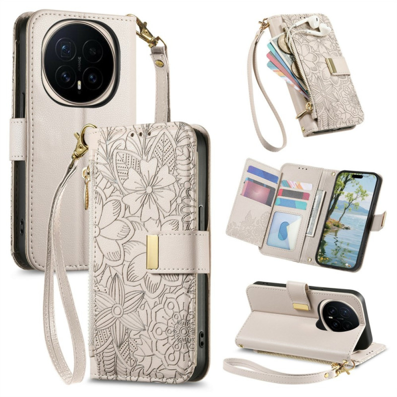 Capa elegante para carteira para o Honor Magic 8 Pro com requintados motivos florais. Inclui várias ranhuras para cartões, um bolso seguro com fecho de correr e uma correia de pulso amovível. Função de suporte integrada para visualização em mãos-livres...