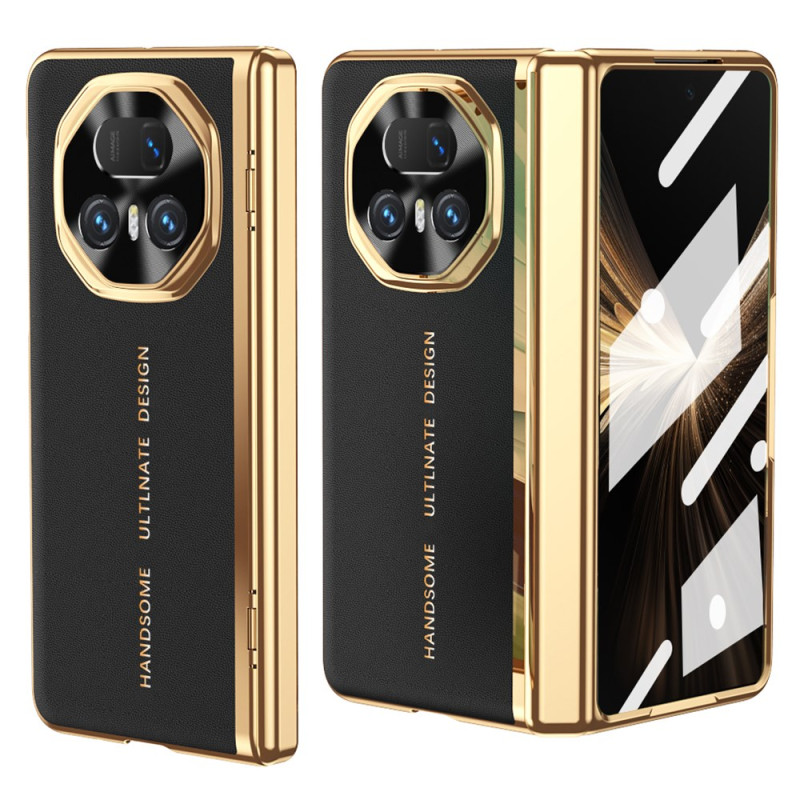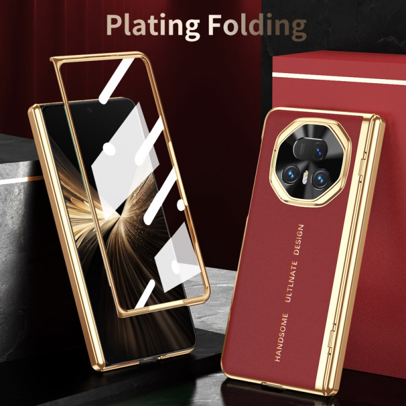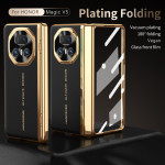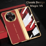 Descubra a nossa luxuosa capa protetora para o Honor Magic V5 5G. Combinando couro PU texturado e PC galvanizado, oferece uma proteção completa com um design elegante. Desfrute de uma proteção melhorada da câmara, de uma tampa frontal de vidro temperado integrada e de um design dobrável a 180°.