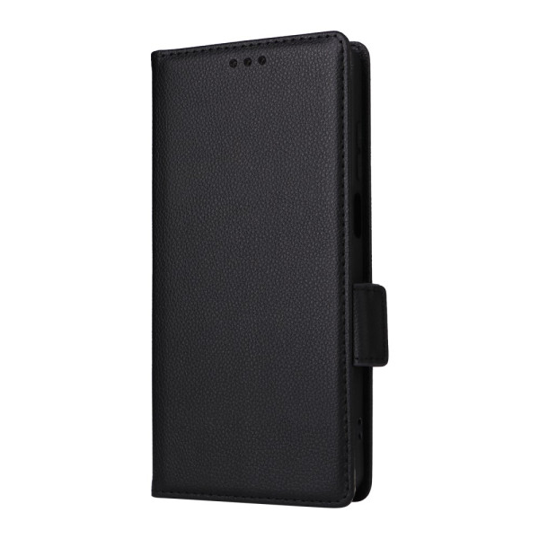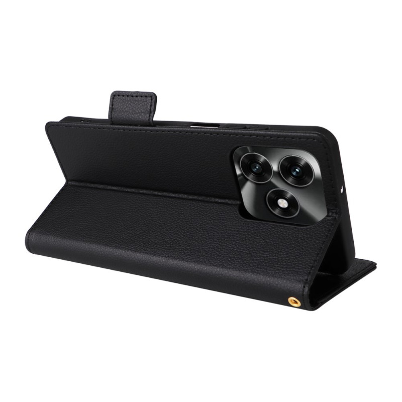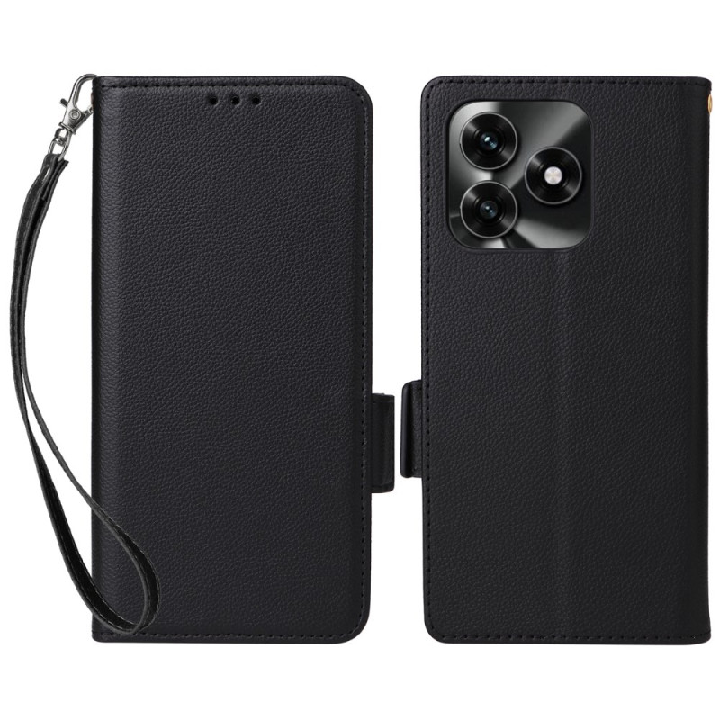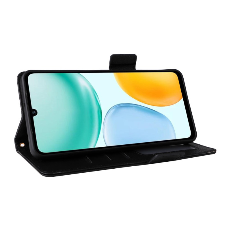 Étui portefeuille élégant avec texture litchi pour Honor X5c Plus. Fonction support mains libres, fermeture magnétique sécurisée et dragonne pratique. Comprend des emplacements pour cartes et espèces...