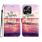 Capa elegante para carteira com o motivo inspirador "Never Stop Dreaming". Design de aba com suporte multi-ângulo, fecho magnético seguro, 3 ranhuras para cartões e alça de mão amovível. Proteção completa e estilo requintado para o seu Honor X5c Plus.