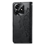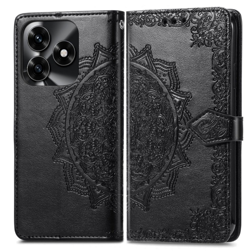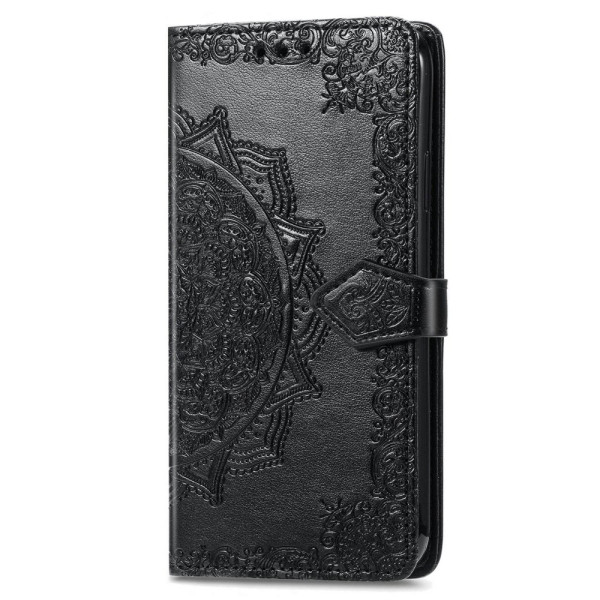 Capa elegante em pele PU com motivo de mandala em relevo para o Honor X5c Plus 4G. Design prático com 3 ranhuras para cartões, bolso para bilhetes, suporte mãos-livres integrado e fecho magnético seguro. Proteção óptima com rebordo elevado.