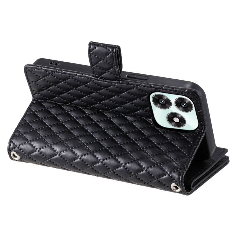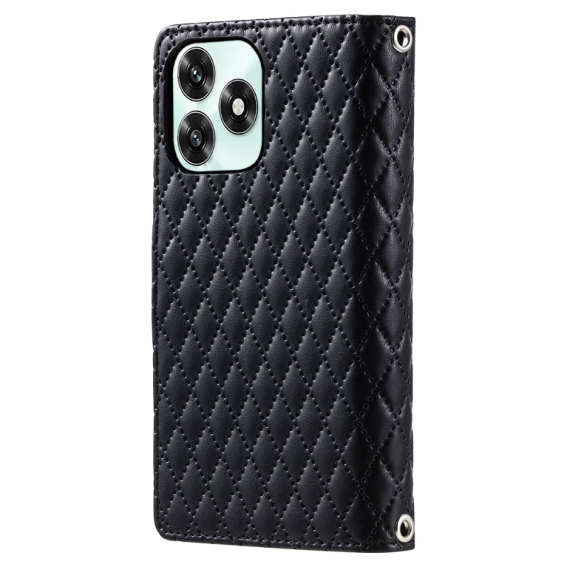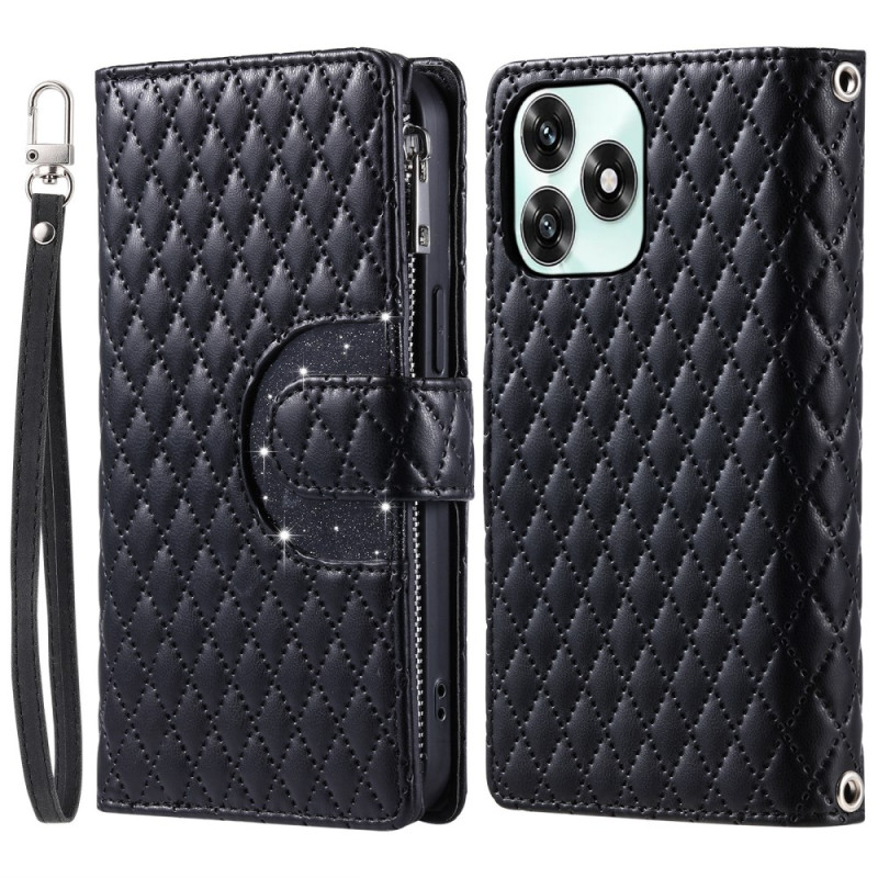 Étui portefeuille en cuir PU avec motif losange pailleté et poche zippée. Design élégant et pratique avec support pliable intégré et dragonne de sécurité. Protection complète contre les chocs et rayures pour votre smartphone Honor.